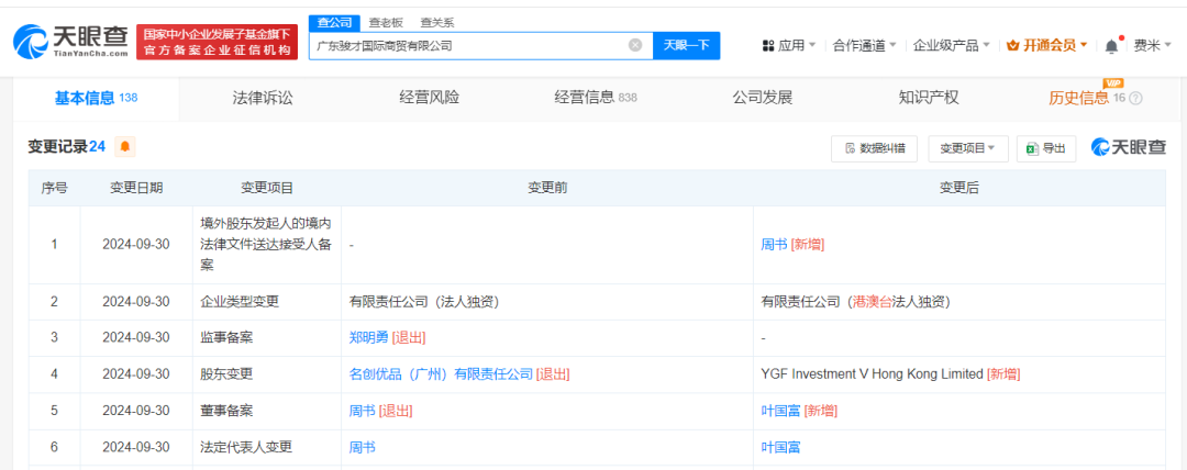 10月15日,天眼查App显示,近日,广东骏才国际商贸有限公司发生工商变更,原股东名创优品(广州)有限责任公司退出,新增YGF Investment V Hong Kong Limited为全资股东,同时周书卸任法定代表人、执行董事、经理,由叶国富任法定代表人、董事、经理。