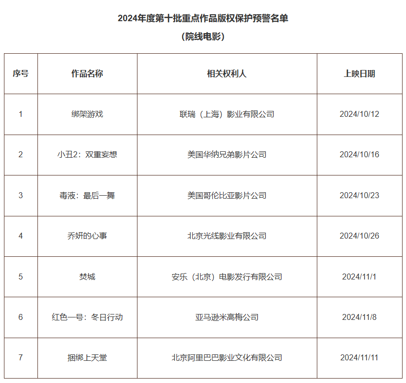国家版权局近日发布2024年度第十批重点作品版权保护预警名单 (院线电影)。《绑架游戏》《小丑2:双重妄想》《毒液:最后一舞》《乔妍的心事》等院线电影上榜。