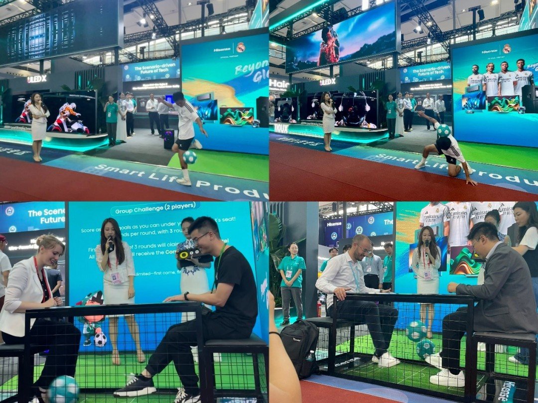现场,海信在广交会展区上设置了花式足球表演、桌下足球互动游戏和能量补给站,吸引众多客商参与游戏和互动表演,吸引大批海外客商驻足海信展区外,氛围热闹欢快。游戏不仅调动了现场观众的热情,也呼应了海信今年与皇马的合作,通过体育营销联系消费者。