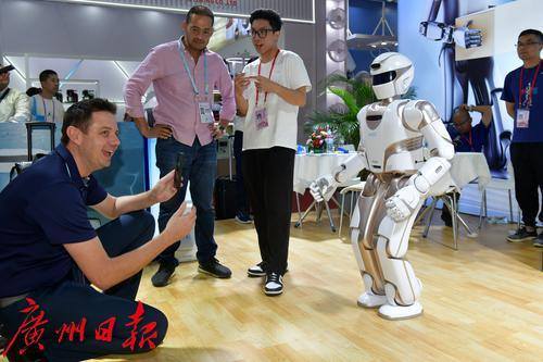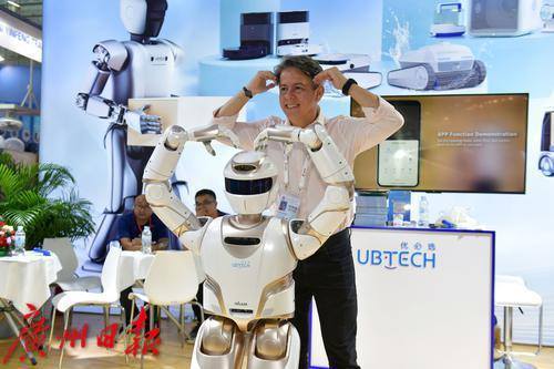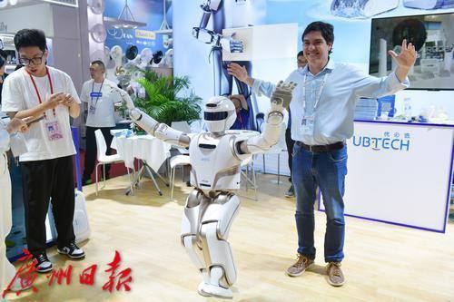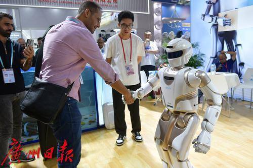 10月16日,广交会展馆A区有一家人形机器人的展位吸引着往来客商的关注,人形机器人会走,会打太极拳还会比爱心,不少客商排队与它握手合影。