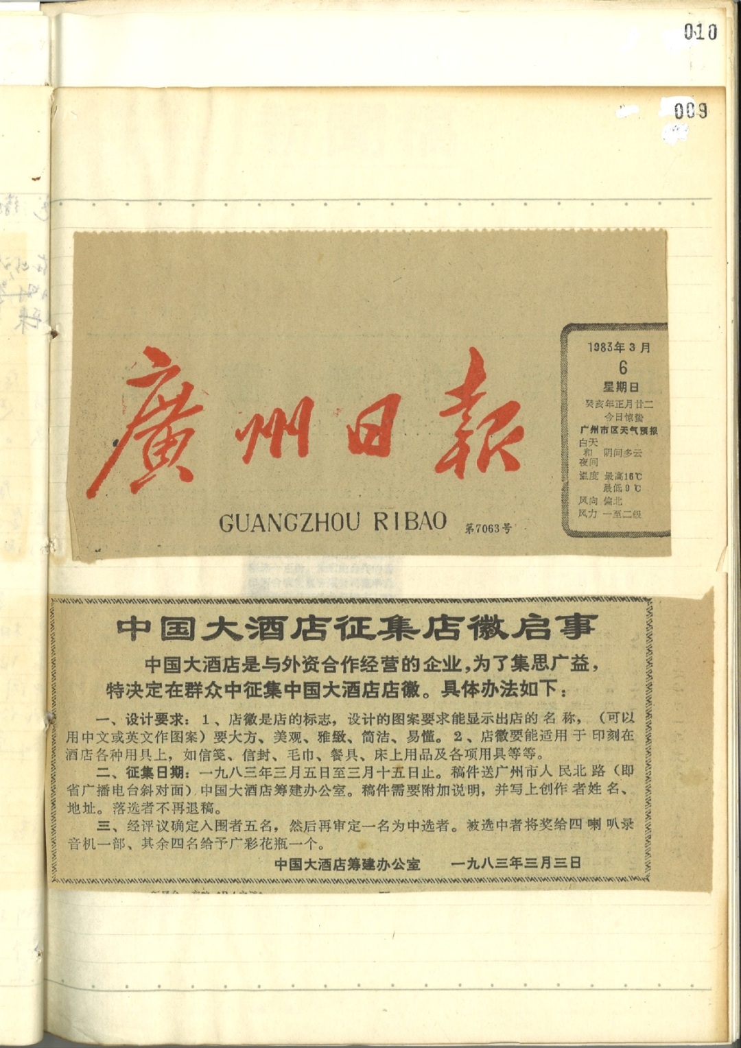 一则刊登于1983年3月6日《广州日报》上的《中国大酒店征集店徽启事》吸引了本报记者的注意。这是中国大酒店当年为集思广益,向群众公开征集酒店店徽而刊登的重要启事,此次也是首次展出。当年,这则启事在《广州日报》刊登之后大获关注,投稿如雪片般涌向酒店。后来,酒店在7026份来稿中采纳了林新穗先生的“红灯笼”设计构思,最终一个以最具中国传统特色的红灯笼为基础、象征喜庆吉利,以“中”字为中心的标志成为这家酒店的店徽。而如此大规模地发动群众参与设计一家酒店的店徽,这不仅在广州的酒店发展历史中成为重要的里程碑事件,体现了开放包容的城市基因和“广式服务”以客为本的精髓。