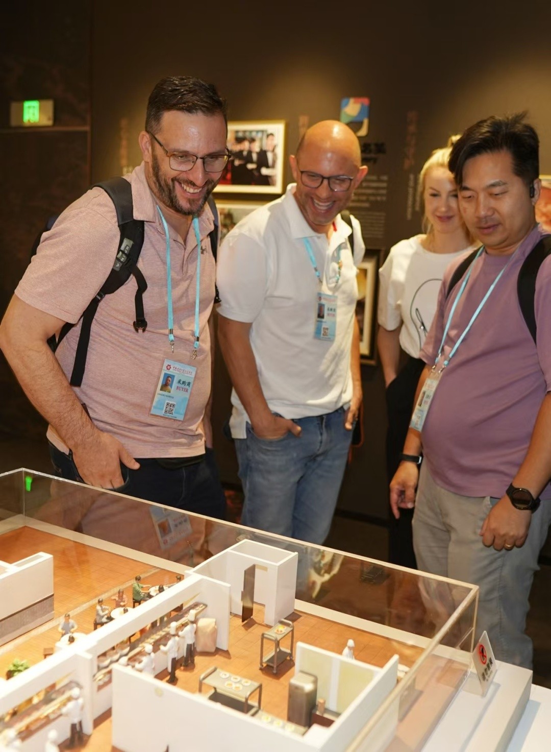 “看了这个展览之后,我都迫不及待要去吃一碗竹升面了!”来自巴西的广交会采购商Bruna Klauck女士和Natalino Simeāo da.Silva成为首批获邀参观历史文化空间的外国宾客,他们刚从广交会返回酒店,就被一旁的展览空间所吸引。他们告诉记者,印象最深刻的是空间内特别复原的中国大陆第一条食街——中国大酒店食街的微缩景观,这些栩栩如生的微缩景观和模型人物形象,让他们站在景观模型前观赏了许久。在模具中,还特别还原了竹升面的摊档和制作方式,这也让来自巴西的广交会宾客大感惊奇:“从来没见过这样制作面食的方式,太奇妙了!”当他们得知中国大酒店在食街餐厅一侧还打造了广式竹升面非遗空间,可以有机会亲眼见证师傅现场压制竹升面的全过程时,就一致决定这几天必须要去打卡,感受一下广州传统食物的文化和魅力。