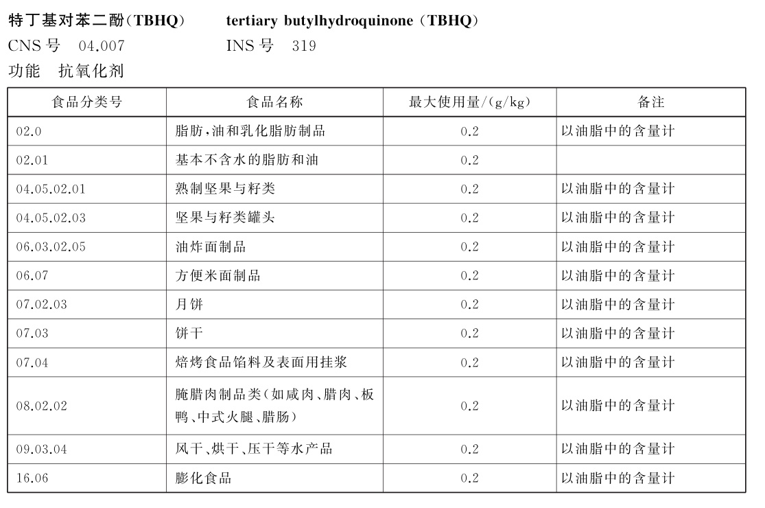 根据我国食品安全国家标准GB 2760-2014《食品添加剂使用标准》,TBHQ最大限量为0.2g/kg,可用于油炸面制品、月饼、膨化食品、坚果与籽类罐头等12个类别的食品中。