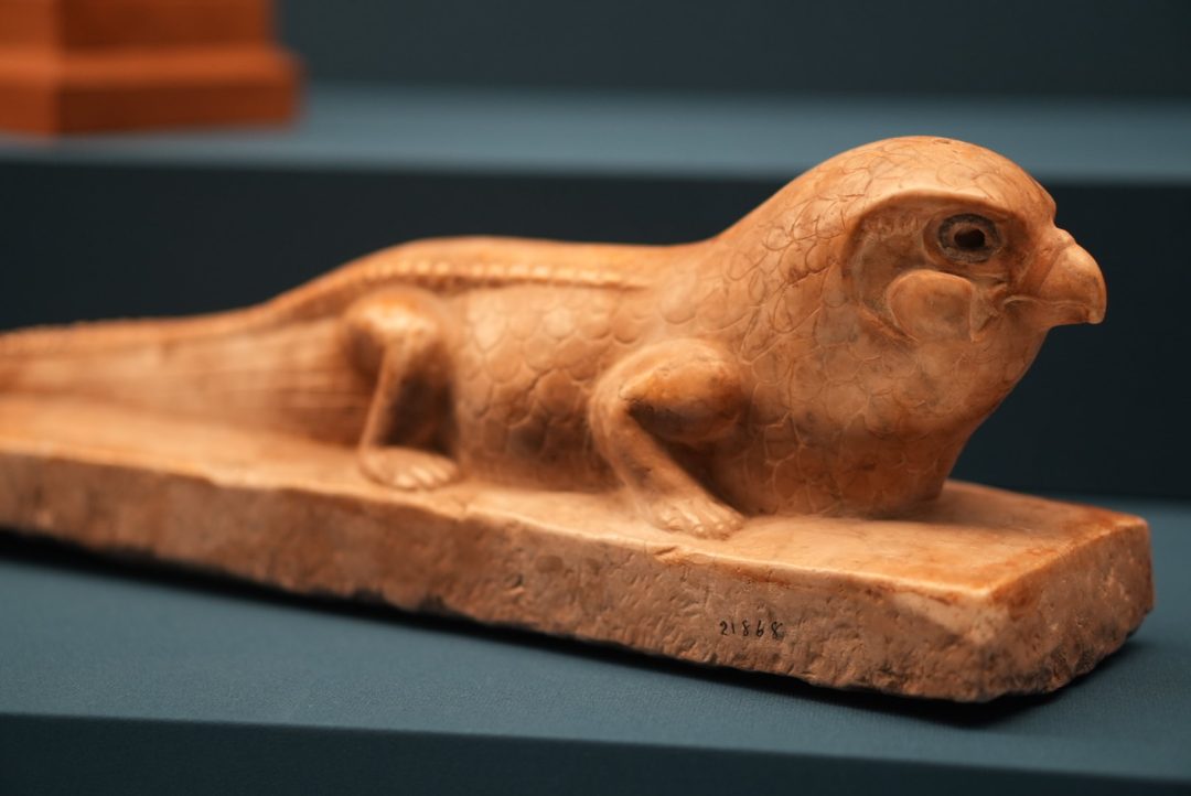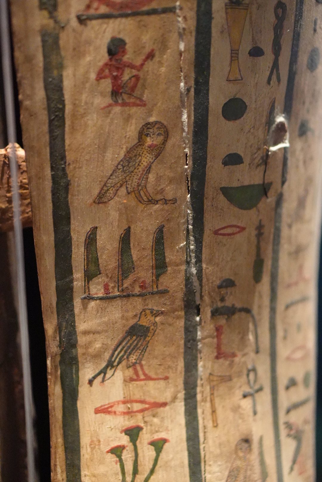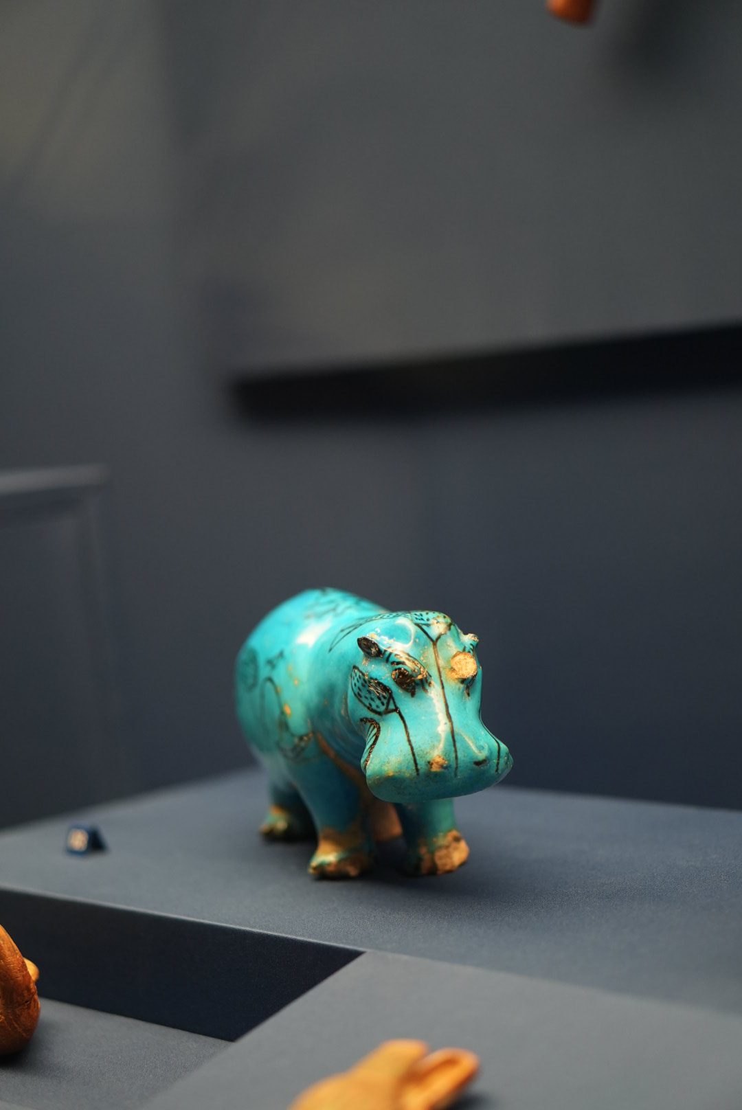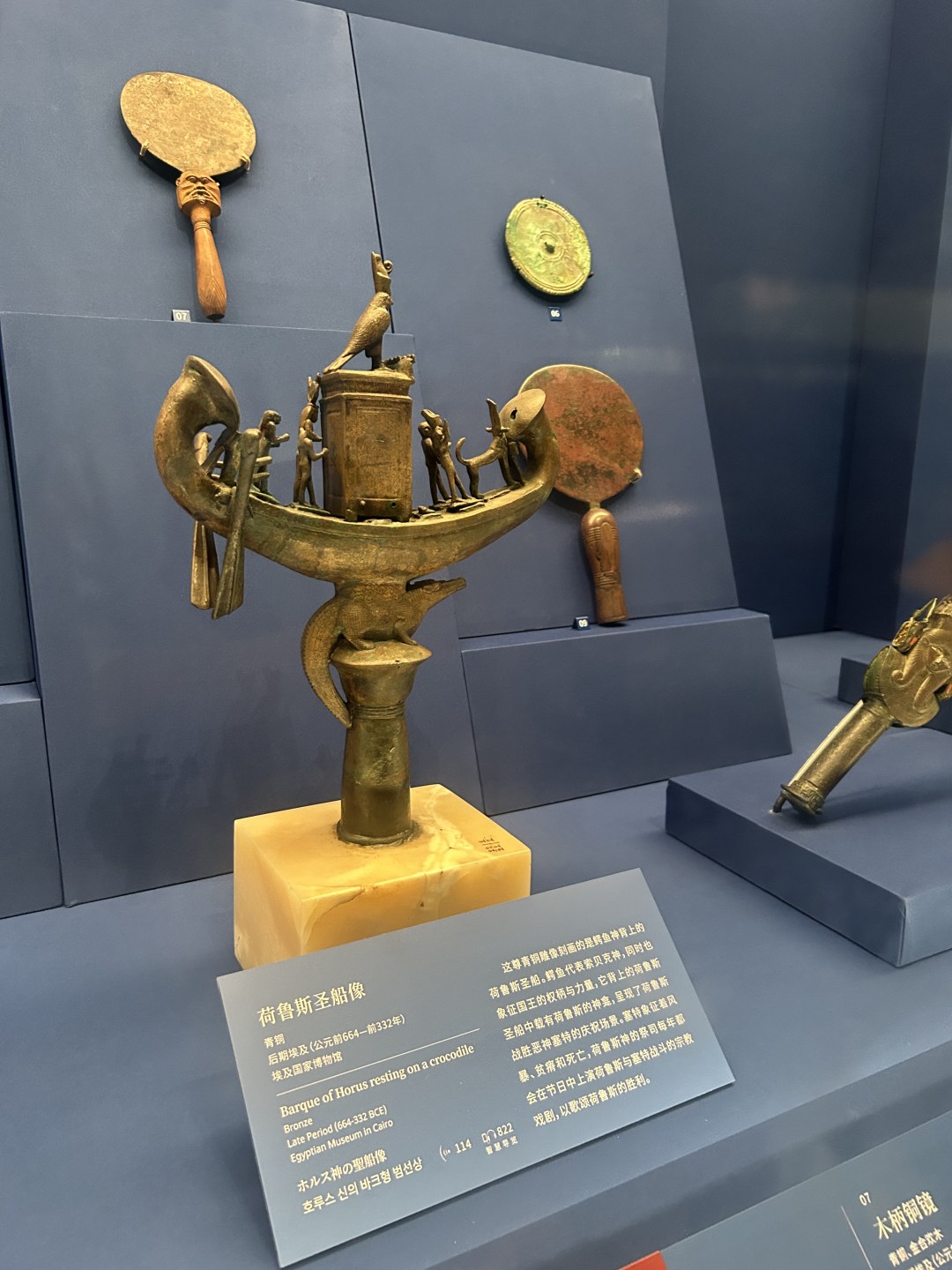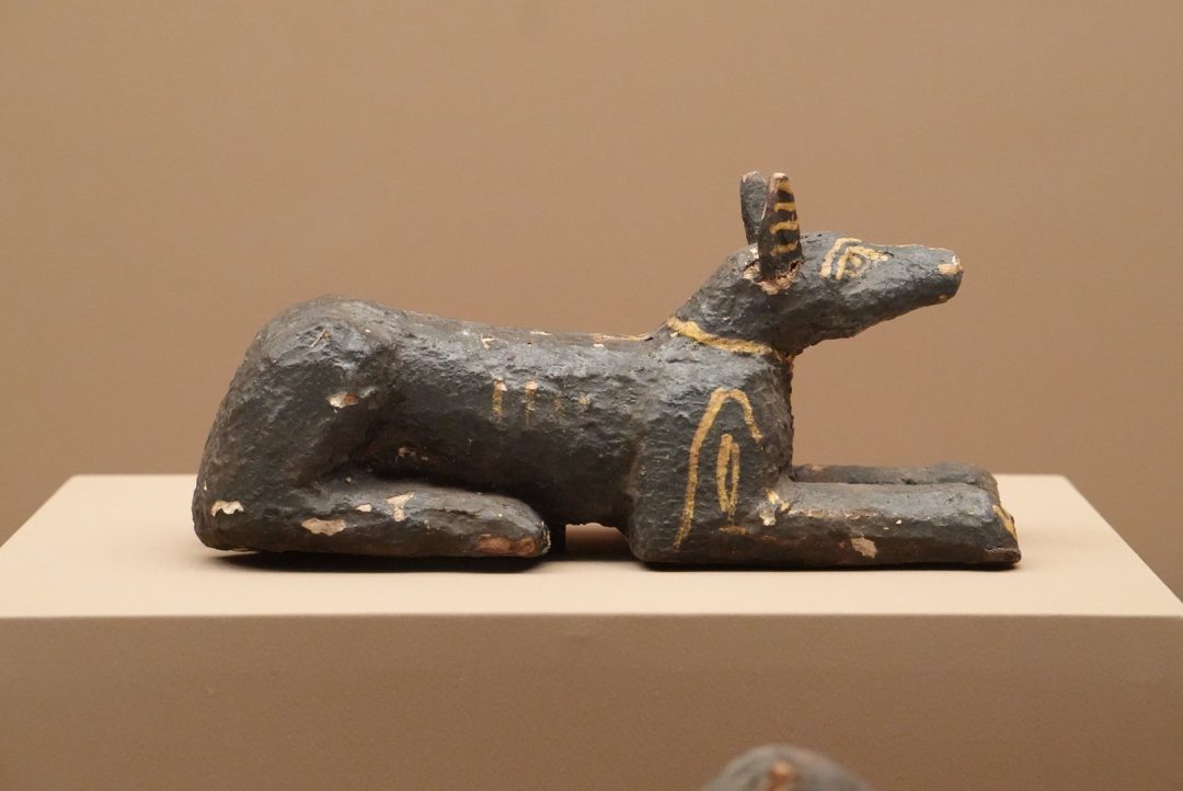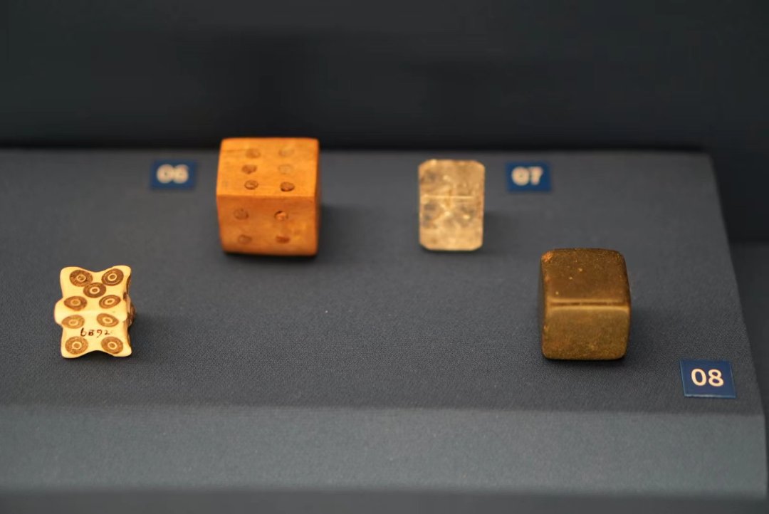 在展厅里,又展出一款游戏棋和不同形态的骰子,这是一种盛行于中王国时期的扮演豺狼和猎犬追逐游戏的棋,棋盘上有58个洞(和一些凹槽)、10个象牙棋子,分为5个狗头和5个狼头,分属两位玩家。考古学家也有猜测,这张棋盘的玩法可能类似于现在的飞行棋,即用骰子点数来决定每一步的行动。