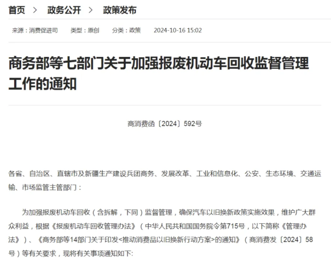 10月16日,商务部、国家发展改革委、工业和信息化部、公安部、生态环境部、交通运输部、市场监管总局等联合发布关于加强报废机动车回收监督管理工作的通知。通知从加强报废机动车回收资质认定管理、引导报废机动车回收企业提质升级、开展打击非法回收拆解专项整治行动、加强组织实施等四方面做了规定。