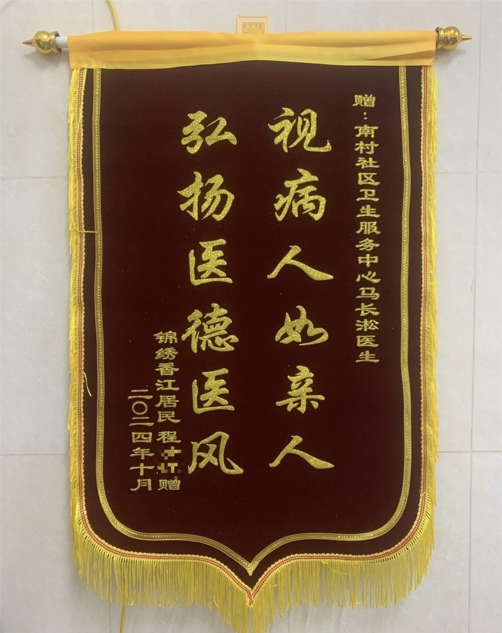 “马长淞医生与我素不相识,他却义无反顾地伸出温暖热情的援助之手,对我关怀备至的照顾和陪伴,让我非常感动!”10月12日,家住锦绣香江社区的程女士一家来到广州市番禺区南村镇社区卫生服务中心,将一面印着“视病人如亲人,弘扬医德医风”的红色锦旗和一封感谢信送到马长淞医生手中,对他的热心行为表示真挚的感谢。