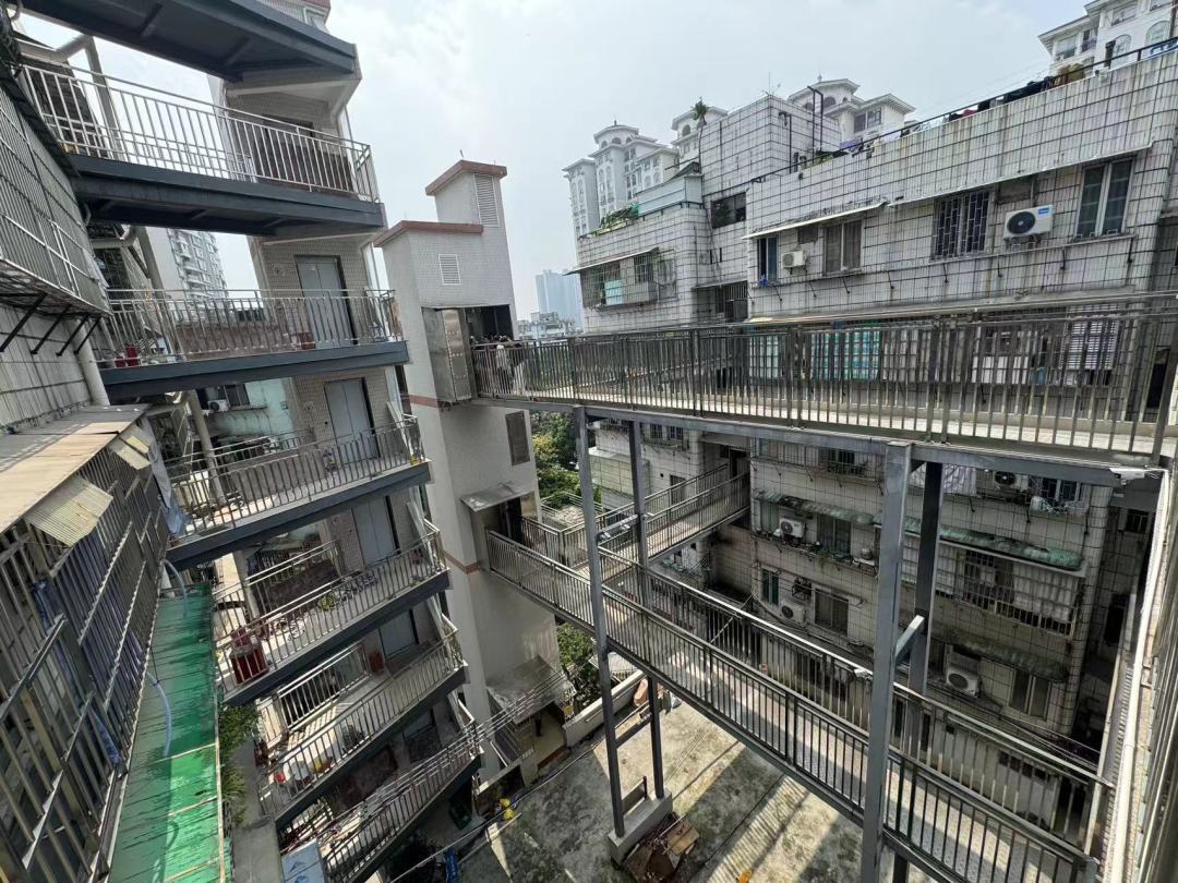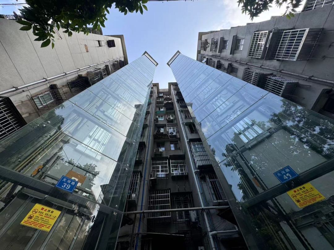 海珠区逸民里16号、17号同样也是商住两用的综合体大楼,1、2层为滨江街道办事处办公场地,3至9层为住宅,居民上下楼需要先经1至3层的公用楼梯,到3楼平台再转换2个建在天井内的单独楼梯,传统毗邻楼梯加装电梯的方案仅能到达三楼平台。在广州市规划和自然资源局海珠区分局积极介入下,会同滨江街道办、海城社区居委会、快科电梯公司等多次协商探讨,最终提出了3层以上建造不落地电梯的大胆设想,有效促成全国首例“不落地”电梯成功投入使用。