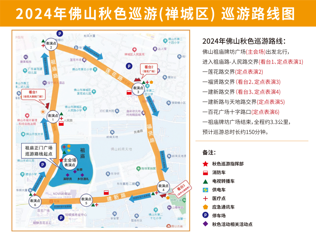(一)路线一:佛山祖庙牌坊广场(主会场)出发北行,进入祖庙路—人民路交界(看台 1、定点表演 1)—莲花路交界(定点表演 2)—福贤路交界(看台 2、定点表演 3)—建新路交界(看台 3、定点表演4)—建新路与天地路交界(定点表演 5)—百花广场十字路口(定点表演 6)—祖庙牌坊广场结束,全程约 3.3公里,主会场表演时间约 90分钟,预计巡游总时长约 150分钟。