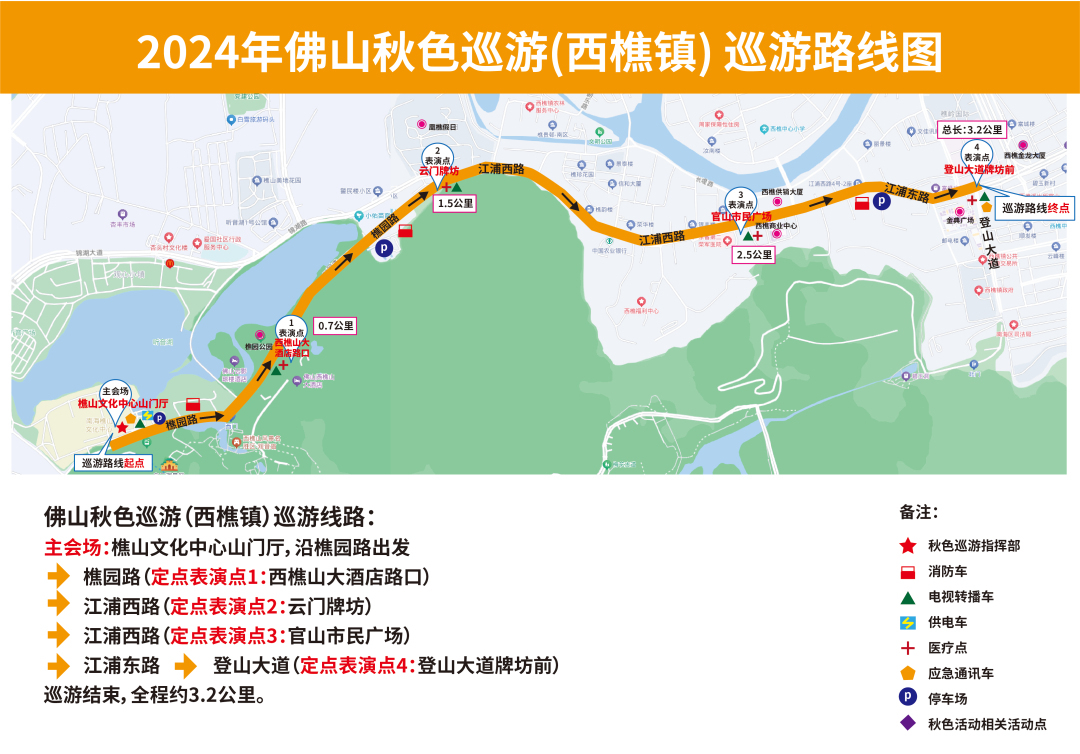 (二)路线二:樵山文化中心山门厅(主会场),沿樵园路出发—樵园路(定点表演点 1:西樵山大酒店路口)—江浦西路(定点表演点 2:云门牌坊)—江浦西路(定点表演点 3:官山市民广场)—江浦东路—登山大道(定点表演点 4:登山大道牌坊前)巡游结束,全程约3.2公里。