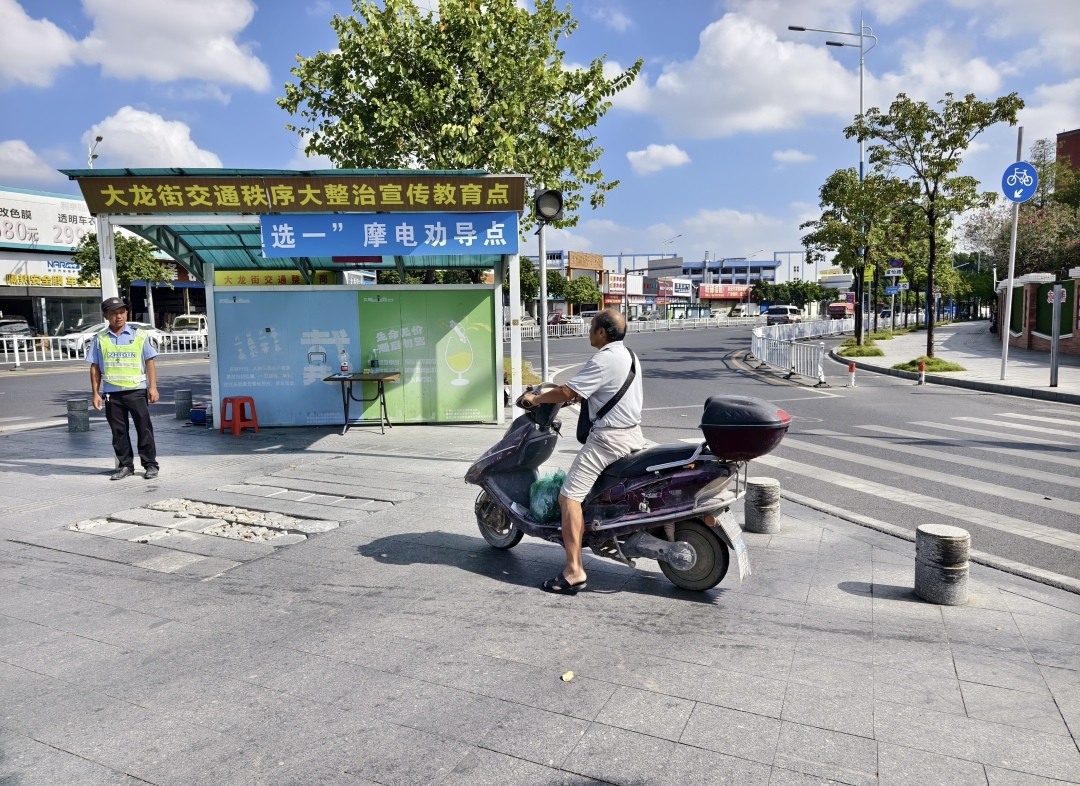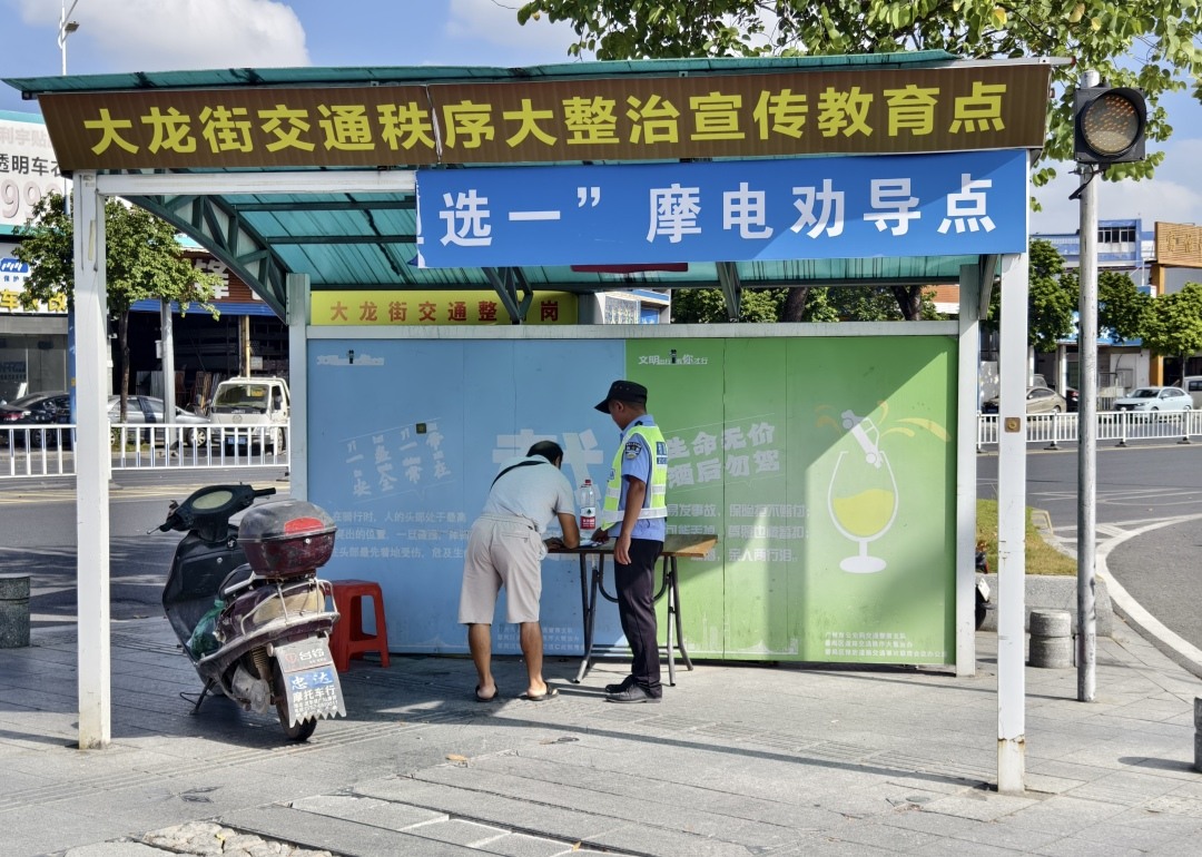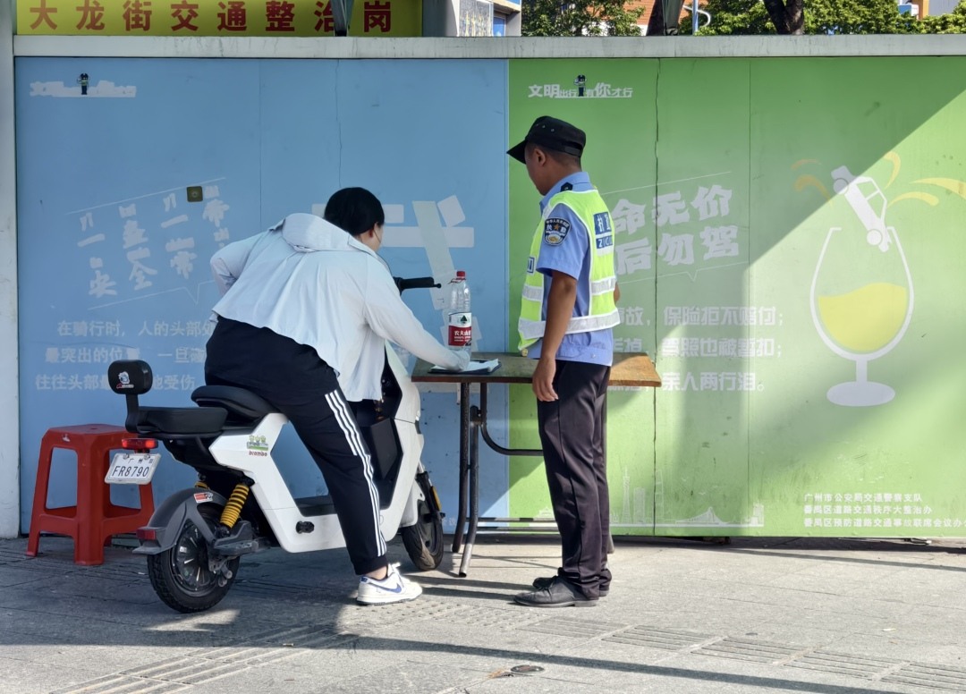 10月17日,广州市番禺区继续开展道路交通秩序整治统一行动。当天上午,记者在市桥街、大龙街部分重点路段路口采访时看到,仍有部分市民骑乘电动自行车不戴头盔,交通志愿者、交通协管员苦口婆心进行劝导。