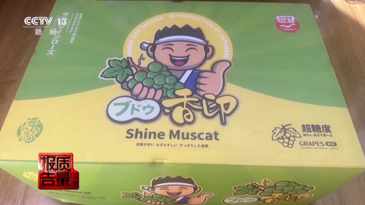 记者随机购买了一箱商家推销的所谓“进口阳光玫瑰”,看到产品的外包装上有清晰的日本文字,并配有卡通人物形象,最醒目的是“香印”两个字。销售人员告诉记者,这个品种叫“香印青提”,和“晴王”品牌都是日本进口的葡萄品种,也可以统称为“进口阳光玫瑰”。