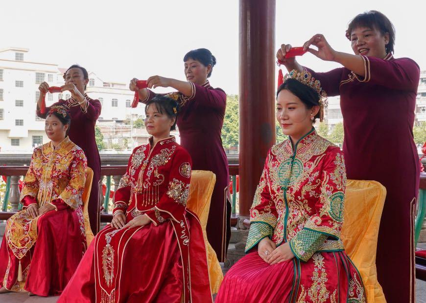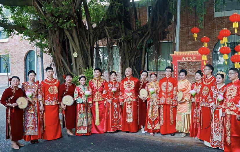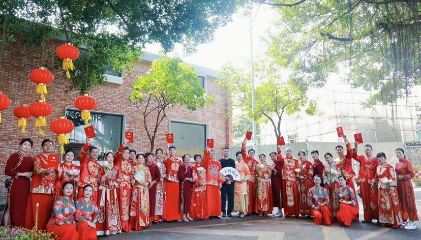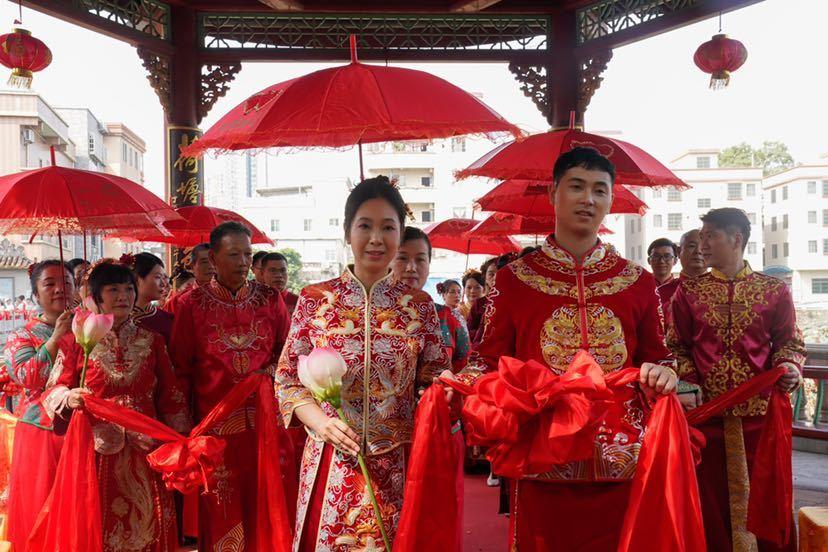 连理树下,情定一生!10月19日,在广州南沙黄阁麦氏大祠堂前,一场“情牵莲溪 麒麟相伴”传统婚俗文化体验活动举行,9对夫妻完整演示了出阁礼、上头、接亲、揭红盖头、捞起、撒米、夫妻对拜、合卺交杯、结发礼等仪式,亲身体验了一场融入了中华民族传统婚俗礼仪、蕴含甜蜜幸福寓意的传统婚礼,还前往连理树下宣读了爱的誓言。期间穿插黄阁特色麒麟舞表演、麒麟引路,将黄阁麒麟文化中麒麟送子、麒麟赐福等祥瑞元素融入传统婚俗礼仪中。