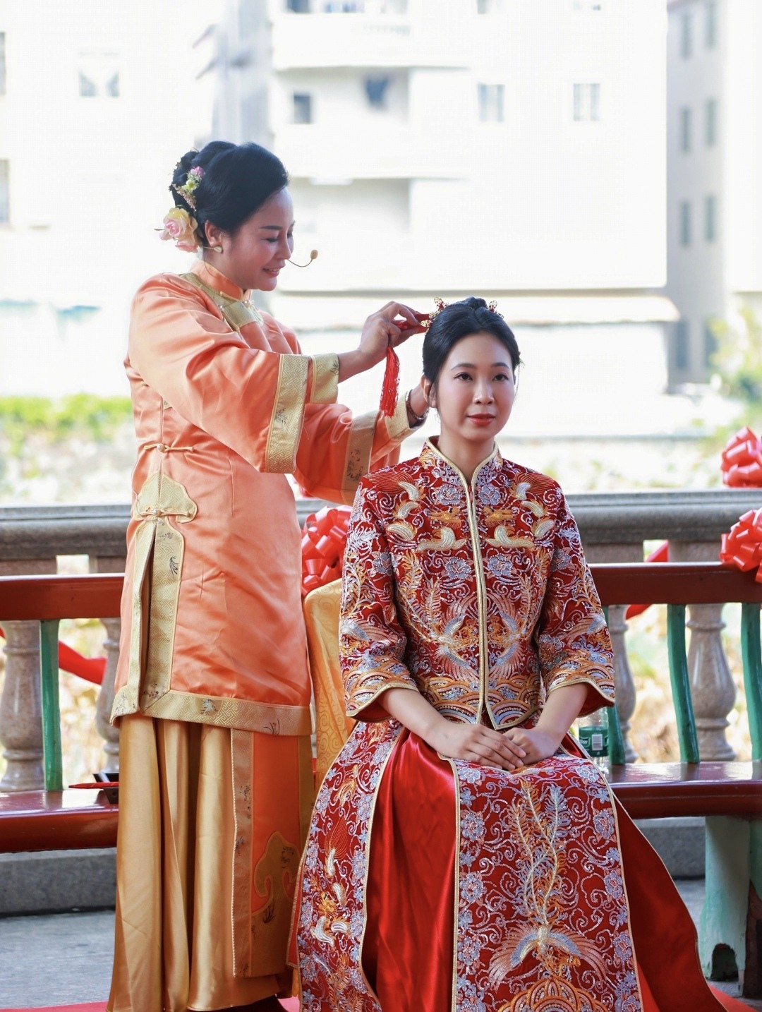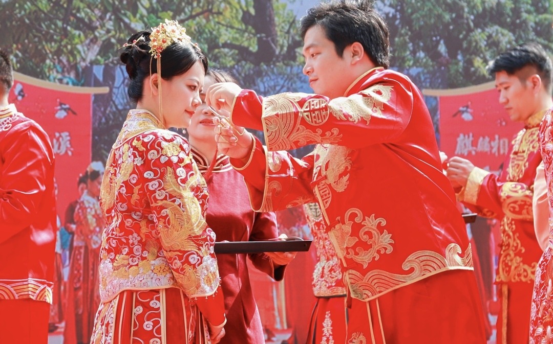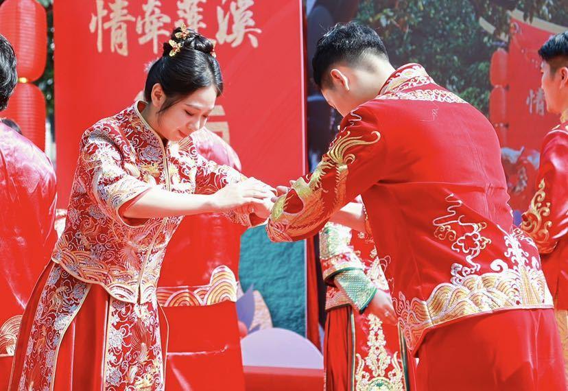 9对夫妻完整演示了出阁礼(挽面、描眉、印唇、映容)、上头、接亲、揭红盖头、捞起、撒米、夫妻对拜、合卺交杯、结发礼等仪式,亲身体验了一场融入了中华民族传统婚俗礼仪的传统婚礼。