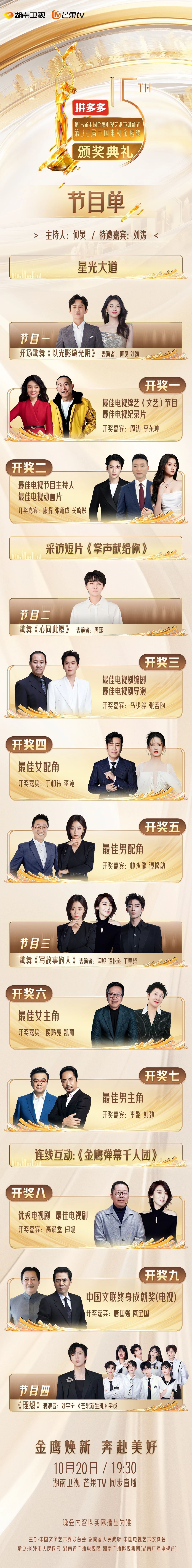 晚会在舞美上别出心裁,将采用镜面舞台,在打造超强现实感的同时,将荧屏内外连接。主持人何炅、特邀嘉宾刘涛以开场秀《以光影敬光明》拉开帷幕,表演中何炅将点名本届入围演员的初心故事,细数金鹰节两年的高光瞬间;周深演唱歌曲《心同此愿》,寄予对于金鹰未来的美好祈愿;通过十年间电视剧作品高能瞬间的混剪,结合闫妮、谭松韵、王星越三位演员代表的现场演唱,情景歌舞秀《写故事的人》致敬十年创作路;刘宇宁将深情演绎歌曲《理想》,表达广大文艺工作者坚守艺术理想的信心与决心。