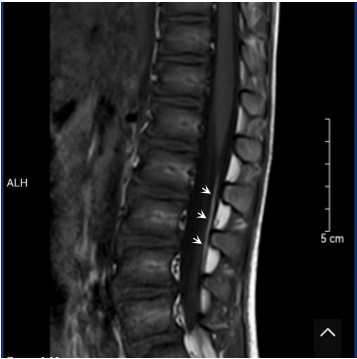 为查清原因,家人带着小健先后前往多家医院,尝试过吃西药,也尝试用中药改善,但效果都不佳,后来前往广州某医院做了详细的B超、磁共振等检查,发现:(1)骶1及以下水平椎板未闭;(2)俯卧位脊髓移动不显著,存在终丝脂肪浸润可能。