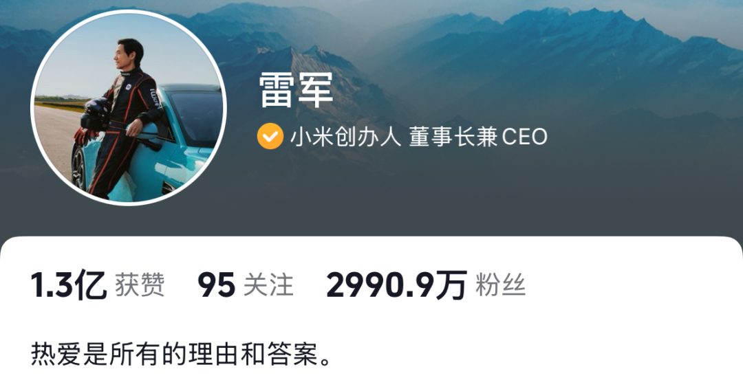 雷军的抖音粉丝量为2990.9万,即将突破3000万,