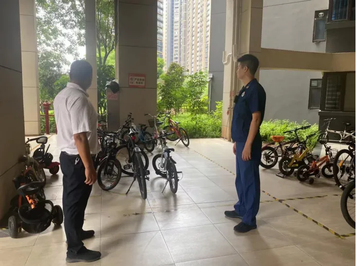 消防人员对重点对小区电动自行车集中停放充电场所进行了隐患检查,随后排查了小区内部是否存在电动车进楼入户、飞线充电、私拉电源线路、乱接插电板、堵塞消防通道等违规行为,检查中发现部分小区内存在电动自行车进楼入户、占用堵塞疏散通道及安全出口、“飞线充电”等违规行为,防火监督员当场责令物业管理负责人立即进行整改,同时向小区业主宣传电动车火灾防范知识,引导群众文明停放电动车,注意充电安全。