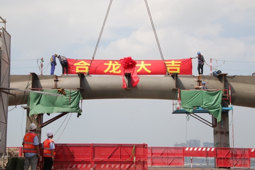 10月21日,深圳前海博物馆项目取得突破性进展,南北立面近百米拱结构外钢梁顺利合龙。前海建投、江南管理、中建科工及中建钢构等参建单位相关人员共同见证这一重大时刻。