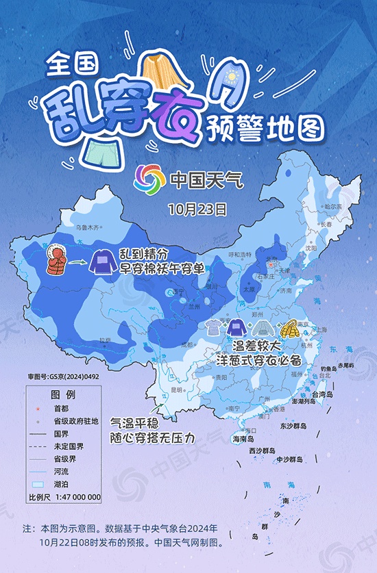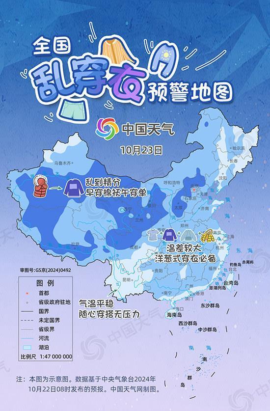 从全国乱穿衣预警地图来看,10月23日,早穿棉袄午穿单范围较大,新疆南部、西藏南部、内蒙古西部、青海、陕甘宁、川西高原、山西、河北北部等地将是穿衣节奏最乱的地方。大城市中,西宁最高气温将在16℃,但最低温仅有3℃,白天单衣保暖即可,早晚时段外出则需召唤棉衣护体。华北中南部至华南的大部地区昼夜温差也较大,可达10℃以上,外出需采用洋葱式穿搭法。