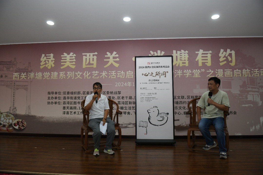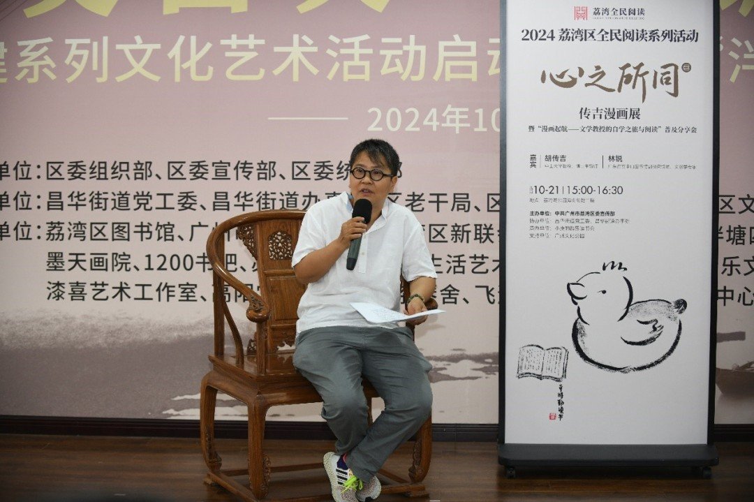 10月21日,由中共广州市荔湾区委宣传部主办,小庚的跨界读书会承办的2024年荔湾区全民阅读系列活动之“漫画启航:文学教授的自学之旅与阅读普及分享”,在广州市荔湾区荔湾湖海山仙馆举行。活动邀请知名专家林锐、胡传吉现场展开学术对谈,现场还举办了“心之所同:传吉漫画展”。