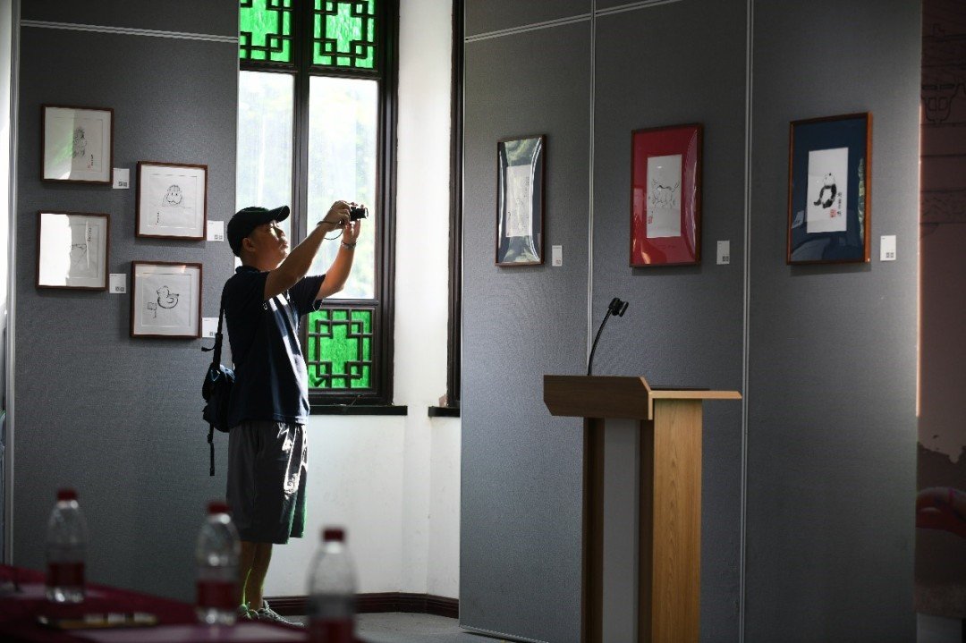 孟子所说的“心之所同然者何也?理也,义也”,情感与理义相契,观者自能心有戚戚。“常见于‘传吉漫画’的动物,既有传统画中的鱼、鸟、猫、牛,也有如今人们喜爱的熊猫、河马、羊驼等,或憨或萌或呆,颇具妙趣,打破水墨旧规”,现场展出的传吉水墨漫画,以其独特的艺术语言,让现场观众时不时会心一笑。