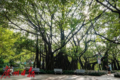 高大的榕树垂下长长的气根须条,阳光透过叶隙洒落。
