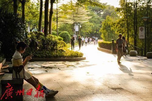 午后斜阳照射下,公园内有人散步,有人闲坐。