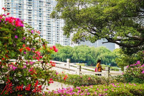 公园中簕杜鹃盛放,市民在湖上小桥走过。