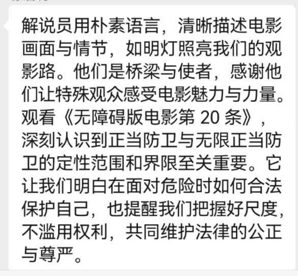 10月15日,星辰社队员曾海燕、刘宁带领新队员同时也是番禺区图书馆志愿服务队的陆小妮、刘利兰、应秀丽,黄瑜军首次合作并成功接力完成了口述电影《第二十条》。活动邀请广州图书馆专家志愿者汪翊律师现场说法,剖析电影《第二十条》中的法律议题,为视障读者提供法律知识的普及和咨询服务。