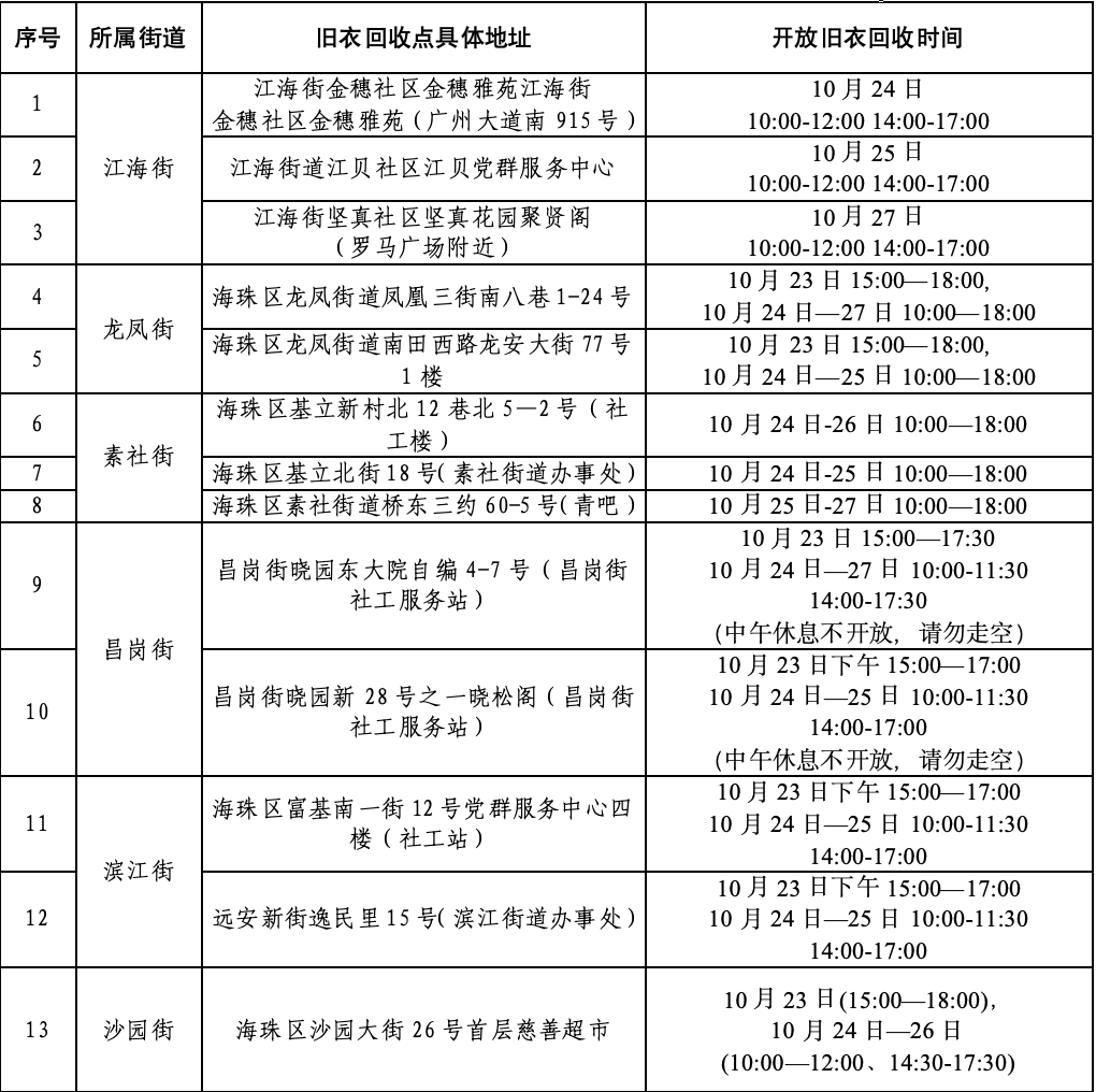 欢迎海珠区广大居民群众在10月23日-10月30日期间就近选择合适的地点捐赠旧衣做公益。