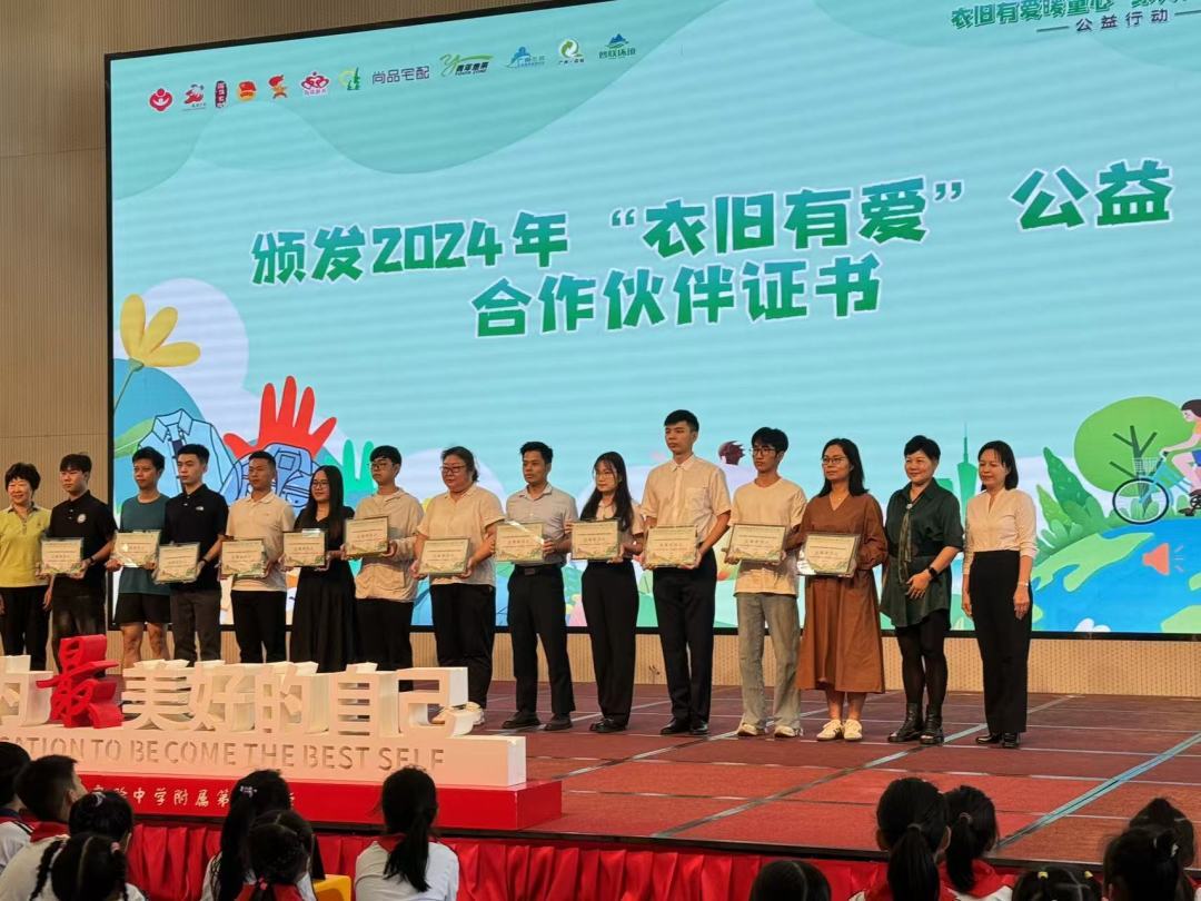 活动现场,一部生动有趣的短片《旧衣“求职记”》从一件旧衣的视角,带领观众了解旧衣环保处理流程以及项目背后的温暖故事。来自海珠区培红小学和海珠外国语实验中学附属第二实验小学的同学们在现场分别带来了诗朗诵《守护绿美校园,共建绿美海珠》和捐衣歌《低碳贝贝》,表达了对绿色生活的向往和对共建“绿美海珠”的支持。随后,活动主办方为参与“衣旧有爱”项目的企业公益合伙人颁发了感谢状。