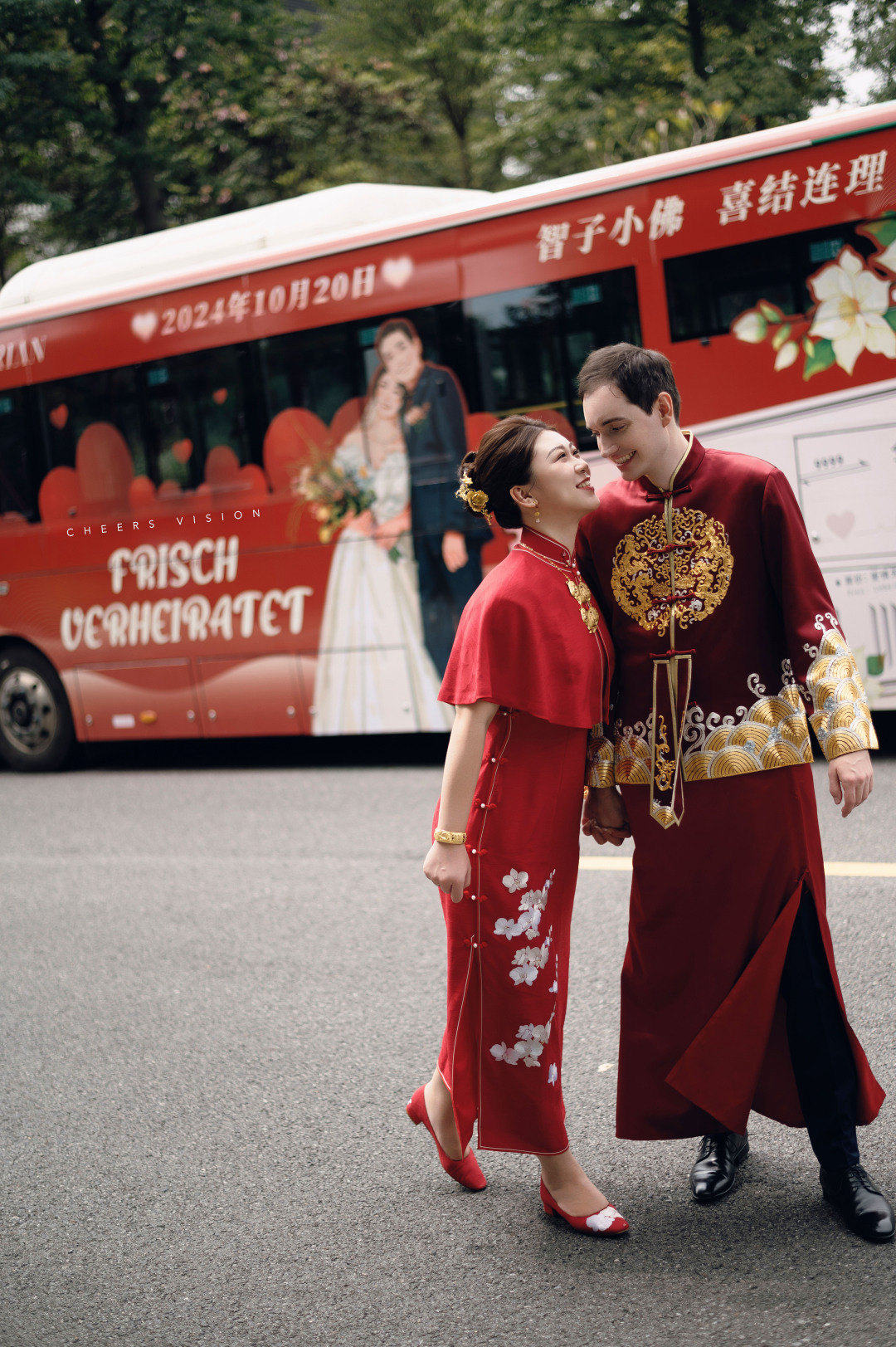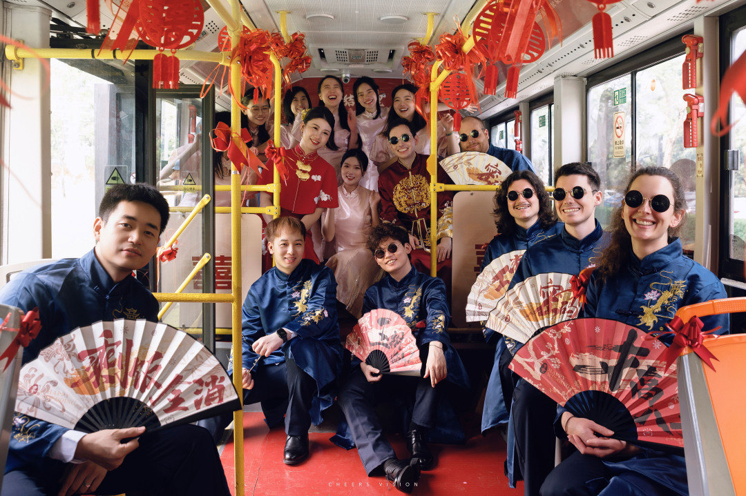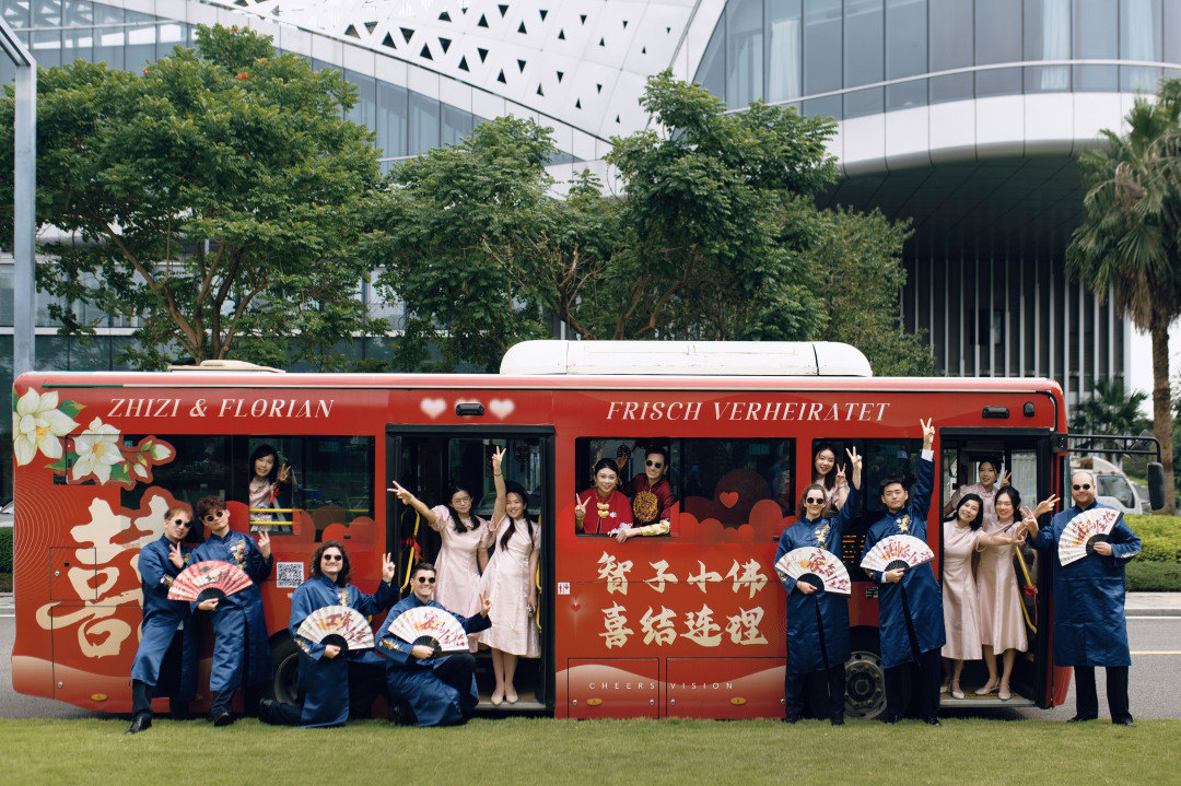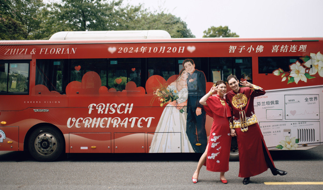 10月20日,一辆红艳艳的公交车吸引众人目光。一对中德新婚夫妇在一辆新中式的巴士婚车上,双向奔赴,携手迈进人生的下一个阶段。