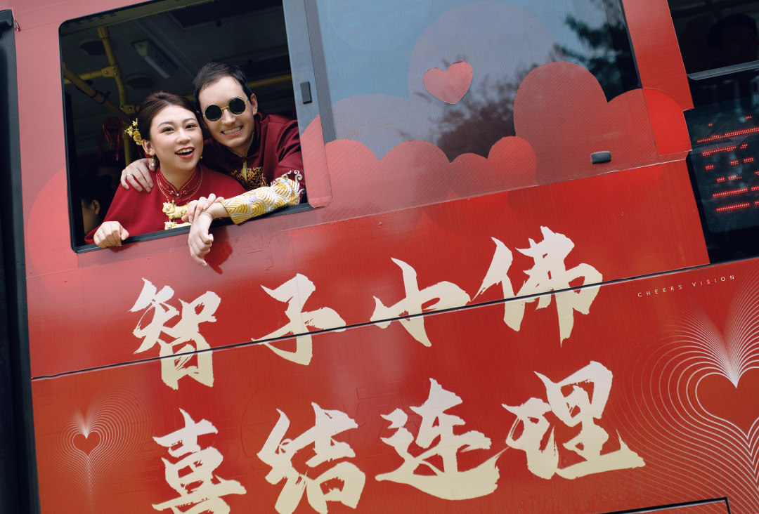 而在车厢内,一字一句皆是浪漫回忆的红线,勾勒这对新人爱情长跑的点点滴滴,让仪式感拉满。10月20日,在这个艳阳天,他们决定在曾经相遇的地方,十指紧扣一起等待一辆专属于他们彼此的、具有纪念意义的巴士婚车,去往人生的下一趟幸福旅程。