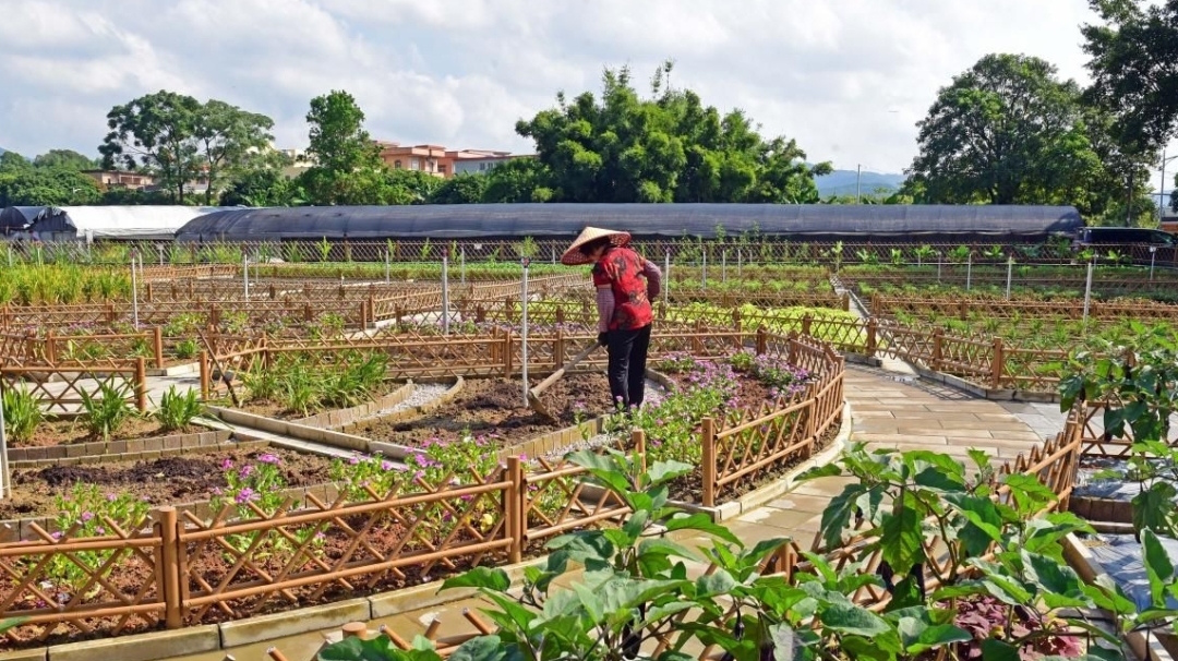 走进小菜园,连片的土地被篱笆间隔成一个个方格和圆形的种植区域,横平竖直,分布有序。紫色的茄子,泛黄的甜瓜,翠嫩的白菜、通菜、秋葵,还有薄荷、紫苏、香蕉、黄花菜、迷迭香……各类瓜果蔬菜、香料作物等生机勃勃,将整个小菜园占据得满满当当。村民们沐浴着和暖的秋阳在地里作业,或忙着打理果蔬,或是挥锄翻土,准备播种下一轮的希望。