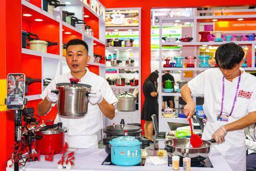 一家参展商的展位上,两位厨师边用厨具烹饪边直播介绍产品。