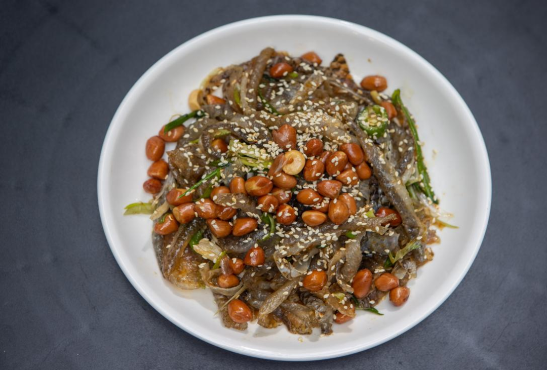 凉拌鱼皮是流行于广州市荔湾区的一道岭南水乡家常菜肴,取新鲜的鲮鱼和鲩鱼鱼皮为食材,用秘制香汁和配料充分调拌后装碟。民间喜称其为“爽鱼皮”,在粤语中,“爽”既是形容食材鱼皮的脆爽,也是形容口感的清爽弹牙。当鱼皮放入嘴里,用牙轻轻咬动,可以感觉到鱼皮丝毫不粗糙,很油滑,嚼劲十足,吃起来的感觉很爽口,不带一丝松软。