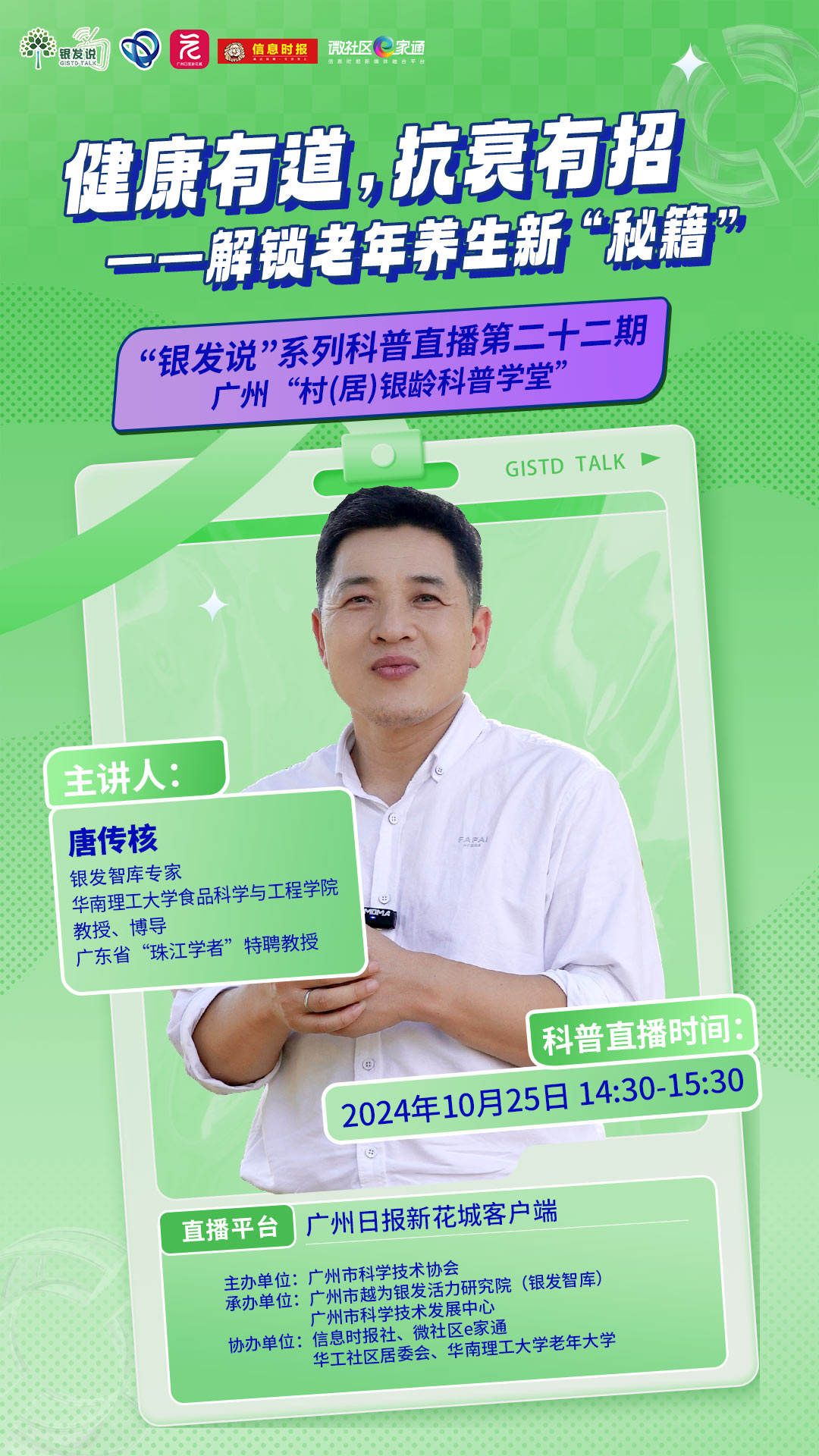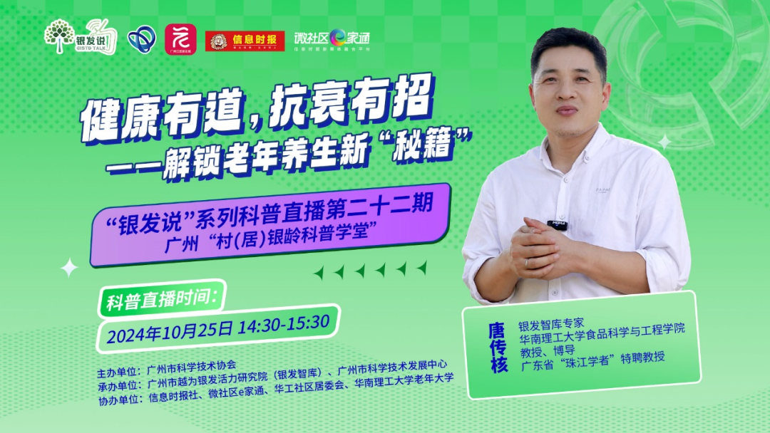 在岁月的长河中,衰老是每个人无法回避的自然规律,但是我们可以通过采取适当的措施来减缓衰老的速度,让自己保持健康和活力。为更好地关爱老年人健康,提升老年人生活的质量和幸福感,10月25日14:30 ~ 15:30,广州市科学技术协会携手广州市越为银发活力研究院(银发智库)、广州市科学技术发展中心、信息时报社、微社区e家通、华工社区居委会、华南理工大学老年大学,举办“健康有道,抗衰有招——解锁老年养生新‘秘籍’”广州村(居)银龄科普学堂第22期“银发说”系列科普直播活动。
