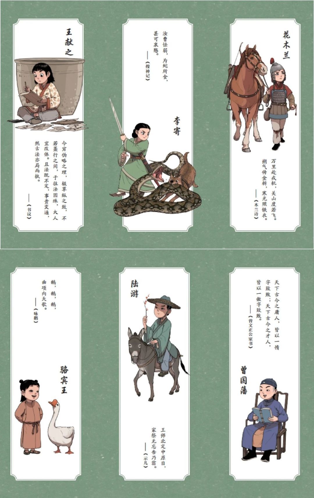 孔融四岁让梨;曹冲七岁称象;骆宾王写出“鹅鹅鹅”也是在七岁;王献之八岁时练字用完三缸水;甘罗十二岁被秦始皇拜为上卿;北魏少女木兰女扮男装替父从军,保家卫国,身经百战……
