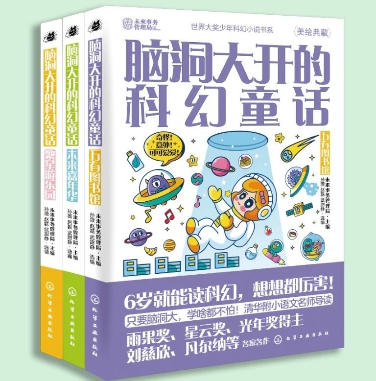 《脑洞大开的科幻童话》一套3册:《脑洞大开的科幻童话:万有图书馆》《脑洞大开的科幻童话:繁星游乐园》《脑洞大开的科幻童话:未来嘉年华》。每本收录短篇小说10篇,都是适合儿童阅读的科幻作品。它们的作者既有世界科幻黄金时代的代表作家,也有雨果奖、星云奖、银河奖、光年奖、引力奖、轨迹奖、阿西莫夫奖等国际大奖的得主。