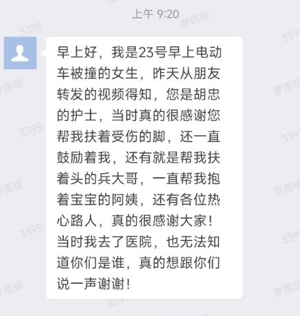 “早上好,我是23号电动车被撞的女士,昨天从朋友转发的视频得知,您是花都区妇幼保健院(胡忠医院)的护士,当时真的很感谢您帮我扶着受伤的脚,还一直鼓励着我。还有各位帮助热心路人,真的很感谢大家!”10月25日上午9点20分,跟往常一样还在工作的罗雨琼收到了这样一条感谢短信,心里顿时感觉暖洋洋的。