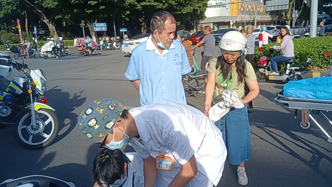 “当天被撞后,真的很感谢您一直帮我扶着受伤的脚,谢谢!”10月25日上午9点20分,花都区妇幼保健院(胡忠医院)医务人员罗雨琼收到了这样一条感谢短信。原来就在两天前的10月23日上午上班高峰期,广州市花都区五小附近发生了一场突如其来的车祸,一辆私家车与电动自行车相撞,伤者现场左小腿骨折。这一幕,被两三米外刚刚送完小孩上学的罗雨琼目睹,面对这种突发事故,她没有多想,马上挺身而出,和其他热心市民、交警一起展开紧急救援。