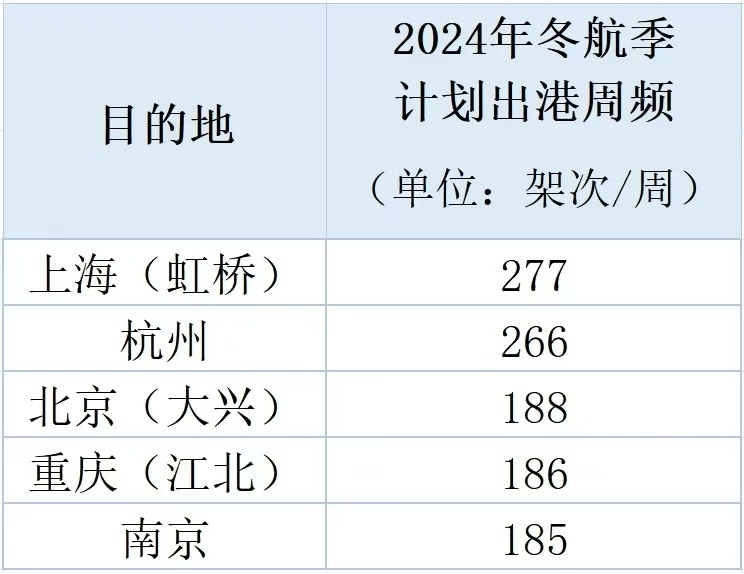 白云机场国内前五大航线分别为上海(虹桥)、杭州、北京(大兴)、重庆(江北)、南京(按照计划量排序)。