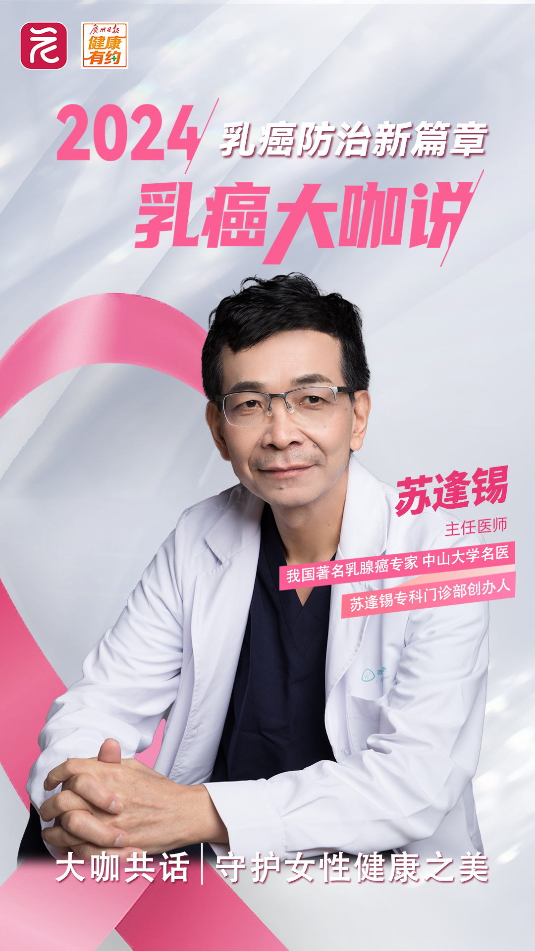 作为我国著名乳腺癌专家、中山大学名医、苏逢锡专科门诊部创办人,苏逢锡教授深耕乳腺癌领域40余年。2019年,他创办苏逢锡专科门诊部,专注对患者进行“全程管理”,致力于提高患者的生存和生活质量。他希望每当提起乳腺癌,患者们能够感受到的是“希望”和“正能量”,而非“消极”和“暗无天日”。他坚信,用积极的能量守护女性的美丽和尊严,这是乳腺科医者的使命和担当。