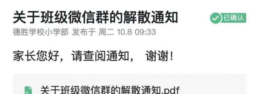 “解散了很好,平时工作群已经够多了,还要逐一看班级信息,十分麻烦。”此举一出,有一些家长表示,一直以来,自己苦“班级群”“家长群”久矣,一是无关信息太多,二是容易引发家校沟通的矛盾。有家长称,类似钉钉等沟通平台,可以只见到老师发送的关键信息,避免一些无关信息浪费阅读时间。不过这些家长还质疑学校解散微信群理由,称即便换了一个新平台,凭手机截屏功能,依旧会出现“聊天记录可能被误转发或不当保存”的情况。