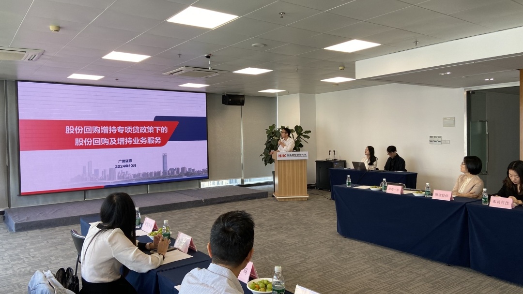 现场,广发证券机构业务部总监蒋伟林为大家带来了《上市公司回购增持业务的综合解决方案介绍》主题分享,引导企业明确回购增持目标与主体、界定市场产品方案的特点与多样化,从而制定出符合自身实际情况的回购战略与最优方案。工商银行广东省行投行业务部副总经理楚庆峰带来了《金融新政:上市公司金融财务交流》主题分享,以宏观金融视觉对政策要点进行了全面讲解,展示了上市公司在回购增持贷款审批过程中的注意事项与审批节点流程。