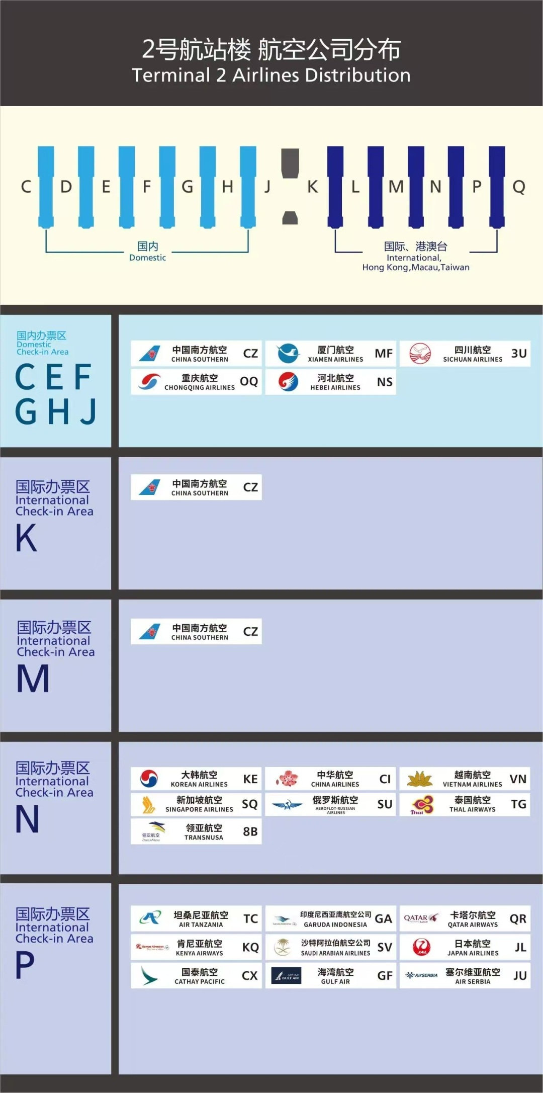 乘坐南方航空CZ的出境旅客,需前往二号航站楼三层出发大厅K、M值机区域办理值机手续,其中,K值机区域为南航国际头等舱公务舱旅客办票区。