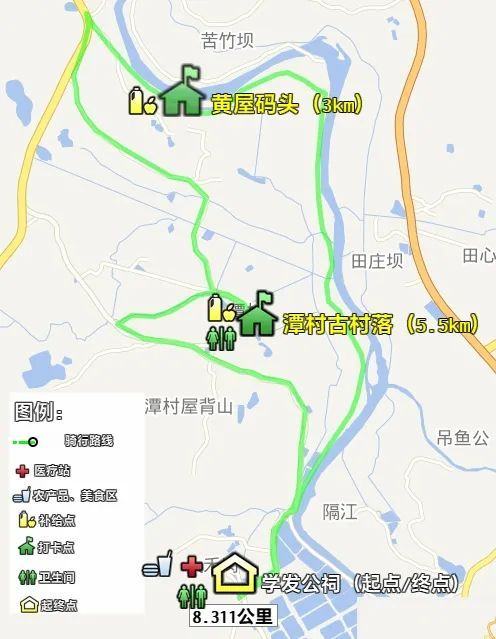 活动路线:和平村学发公祠—禾田童话民宿—河堤路—黄屋码头服务打卡点—S260(约200米)—潭村村牌坊—潭村村委会—潭村古村落—潭村古村落服务打卡点—和平村学发公祠(全程约9km)