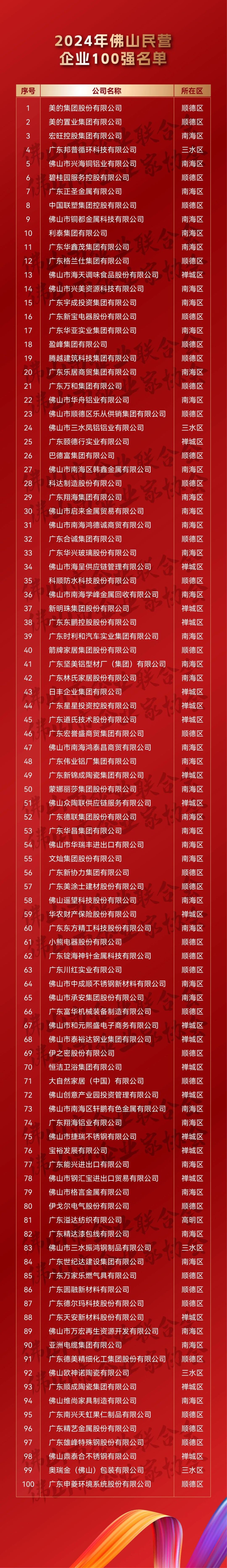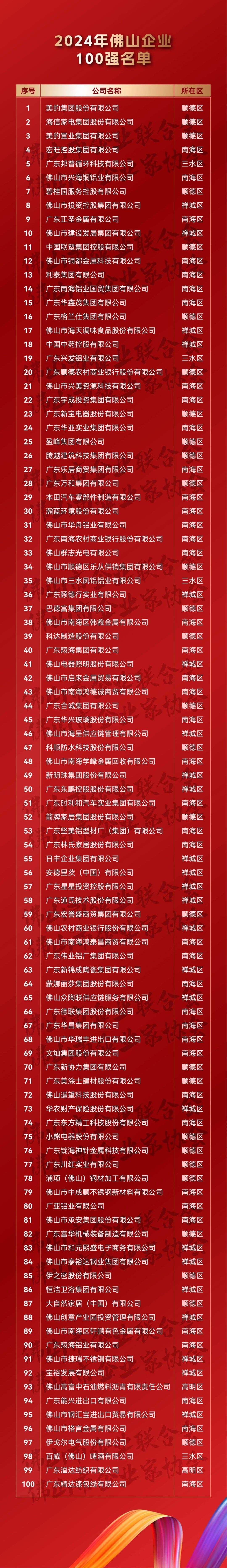 10月26日,佛山市企业联合会、佛山市企业家协会成立40周年庆典暨年度佛山企业家活动日上,2024年佛山企业100强、制造业100强、民营企业100强三大榜单正式出炉!
