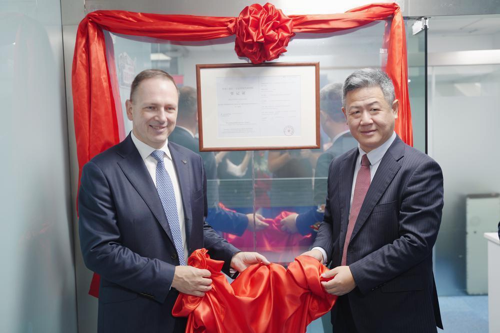 塞尔维亚航空首席执行官吉瑞·马雷克(Jiri Marek)(左一)与中国区总代表(美凯航服 副总裁)吴国飞共同揭幕