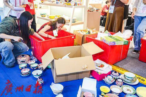 参展商们一边进行打包,准备撤场,一边摆出陶瓷碗、杯样品供客人挑选。